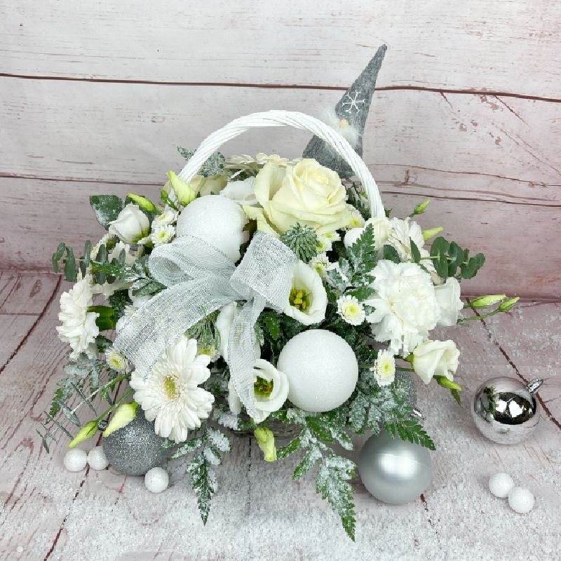 ‘Winter Wonderland' is inspired by the magic of Christmas, guaranteed to bright up your loved ones day this Christmas. It is a beautiful basket arrangement and added a cute little Christmas gonk gnome. This wonderful arrangement includes Germini, Roses and Lisanthus - with foliages being sprayed with spray “snow.”